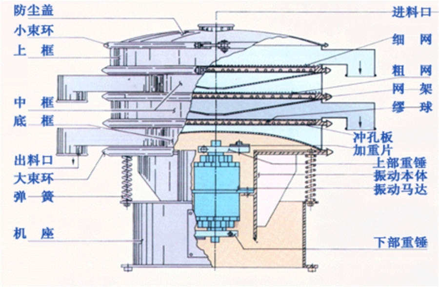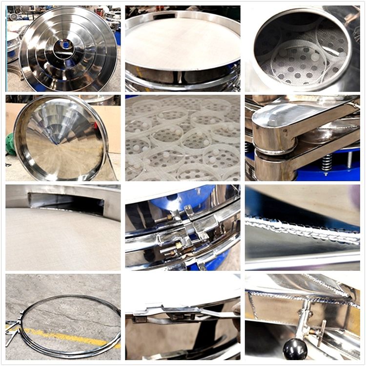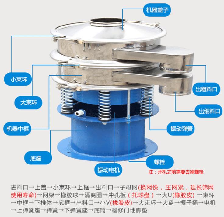 旋振篩是一種高精度細(xì)粉篩分機械,其噪音低、效率高,快速換網(wǎng)只需3-5分鐘,全封閉結(jié)構(gòu),適用于粒、粉、粘液等物料的篩分過濾。旋振篩是由直立式振動電機作激振源,電機上、下兩端安裝有偏心重錘,將電機的旋轉(zhuǎn)運動轉(zhuǎn)變?yōu)樗健⒋怪?、傾斜的三次元運動,再把這個運動傳遞給篩面。調(diào)節(jié)電機上、下兩端的相位角,可以改變物料在篩面上的運動軌跡。