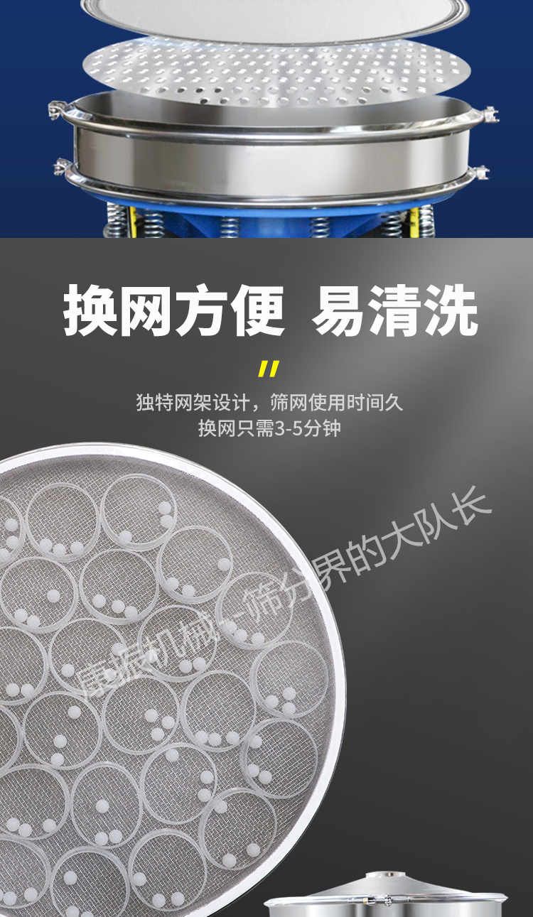 篩網(wǎng)更換便捷—旋振篩根據(jù)不同需要有多種網(wǎng)架結(jié)構(gòu);其中一種把更換篩網(wǎng)的時(shí)間降到3~5分鐘,比其他類型篩機(jī)節(jié)約30~60分鐘。篩網(wǎng)壽命更長,效率更高。