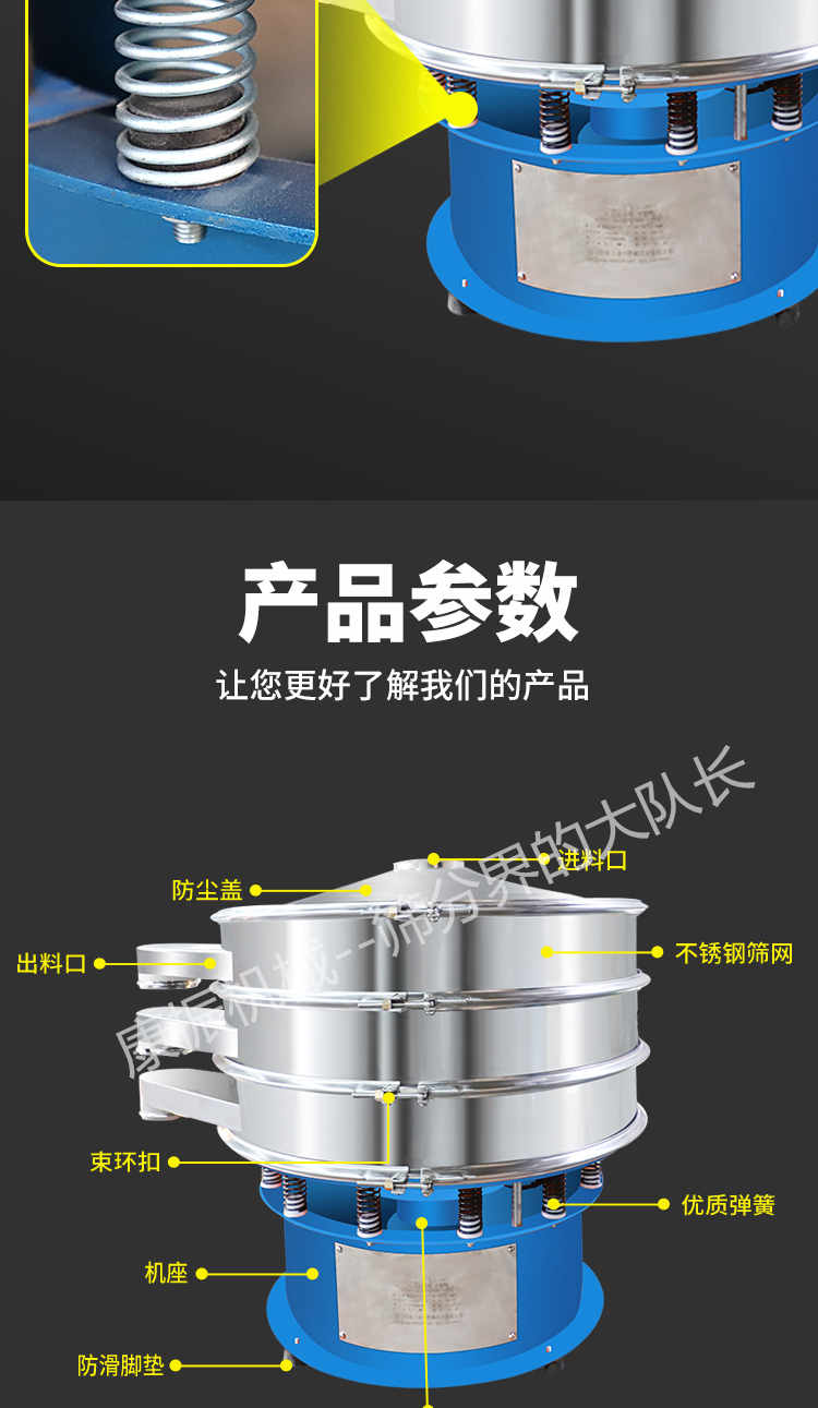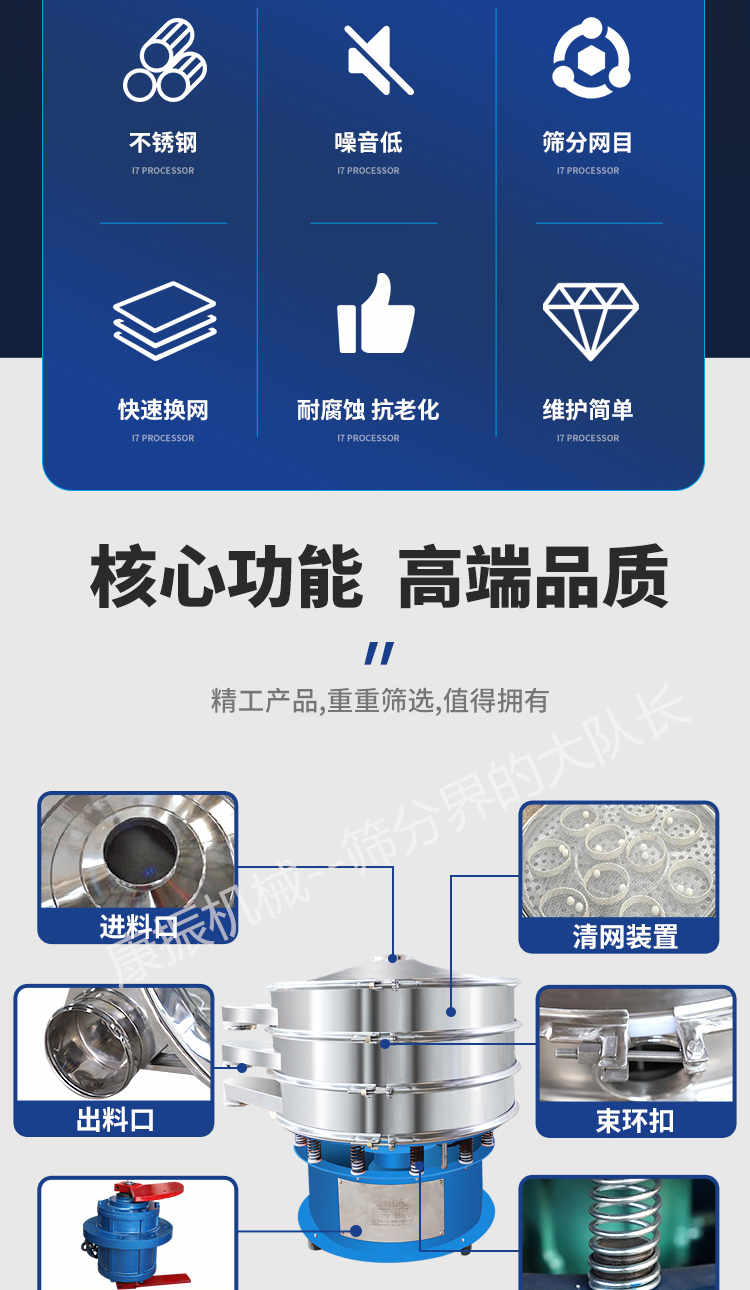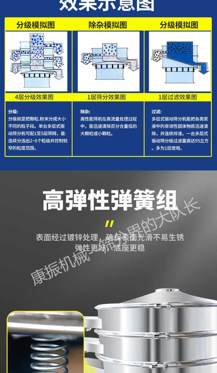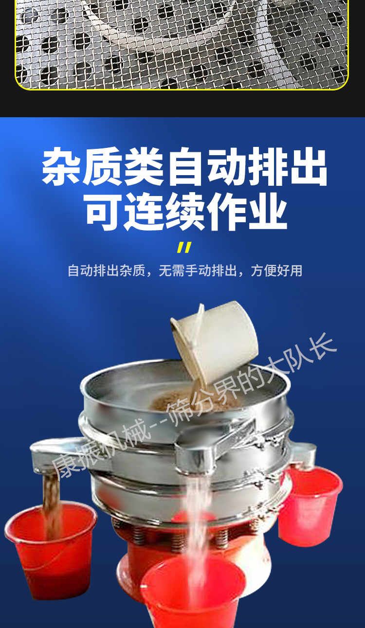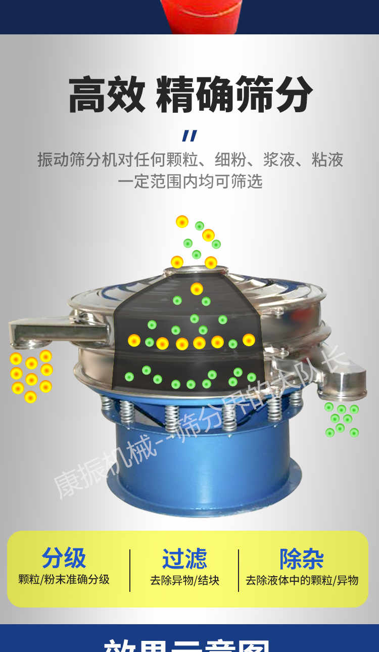 3、去雜質(zhì):本設(shè)備可對大量物料,除去大小不同的小部分物料,進(jìn)行快速分離。