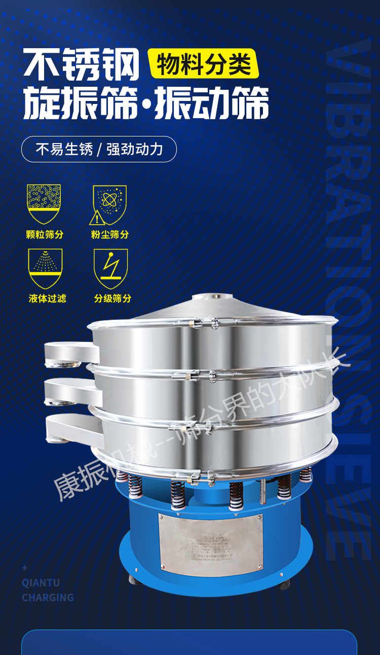 2、去液體:本設(shè)備單層、多層使用,可十分有效地處理固體、液體的混合物料??焖賹?shí)現(xiàn)固液分離,并篩選過濾出不同的目的物料。